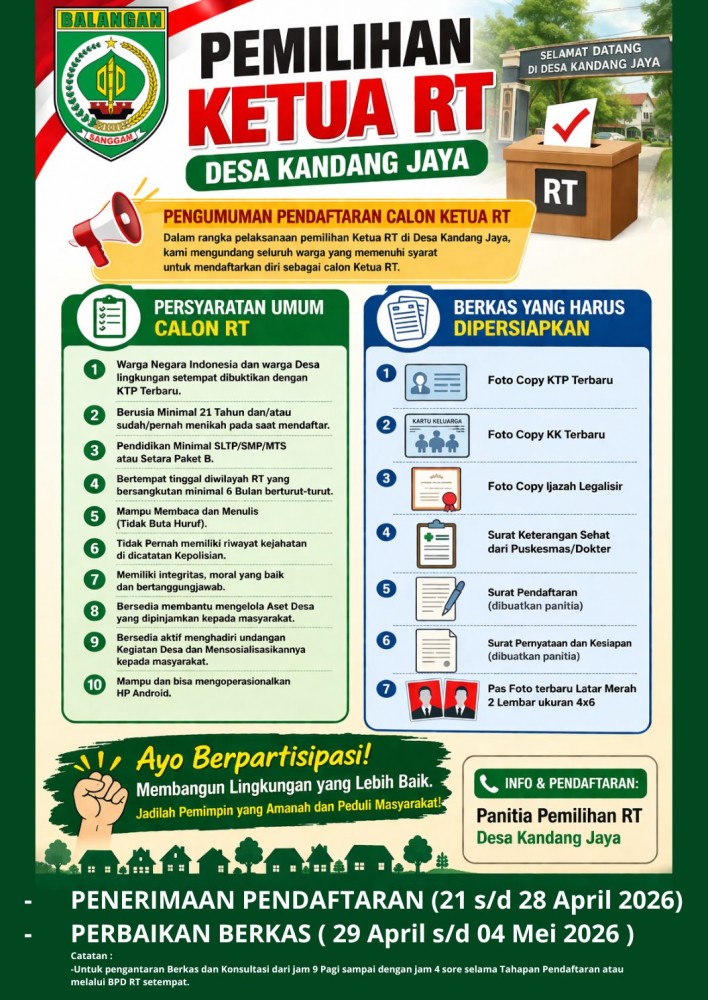 PENGUMUMAN !!!!!!!!!! TAHAPAN PEMILIHAN RT (RUKUN TETANGGA) DESA KANDANG JAYA RT 01 sd 04 KECAMATAN LAMPIHONG KABUPATEN BALANGAN - PENERIMAAN PENDAFTARAN (21 s/d 28 April 2026) - P… selengkapnya